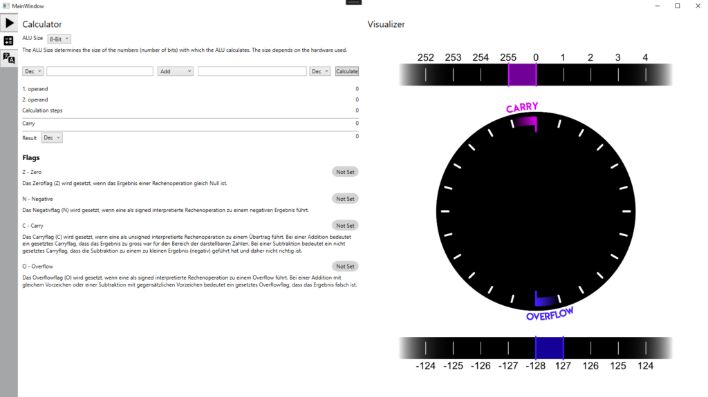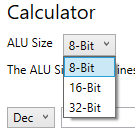 Wie bereits in der Einführung erläutert, umfasst der Calculator drei verschiedene ALU-Sizes. Die ALU des simulierten CT-Board-Simulators arbeitet stets mit einer 32-Bit-ALU. Dabei ist zu beachten, dass die ALU immer hardwareabhängig ist und zu Lernzwecken einfachheitshalber oft als 8-Bit oder 16-Bit verwendet wird. Daher können alle drei Grössen im Calculator eingestellt werden.