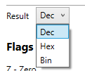 Das Ergebnis kann ebenfalls in allen drei Zahlensystemen ausgegeben werden. Der Wechsel des Systems erfolgt auch hier durch Anklicken des Dropdown-Menüs. Die Auswahl der Ausgabe wird jedoch erst bei der nächsten Berechnung berücksichtigt.