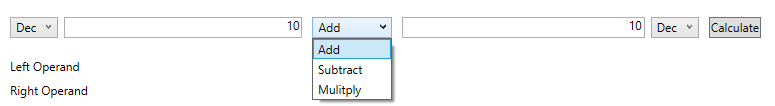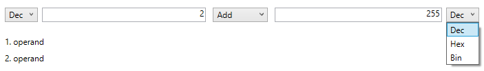 Da beim Programmieren situationsabhängig Operanden in verschiedenen Zahlensystemen verwendet werden, bietet der Calculator die drei wichtigsten an. Dazu zählen das Dezimal-, Hexa- sowie das Binärsystem. Für jeden Operanden kann das Zahlensystem individuell eingestellt werden. Die Auswahl erfolgt über ein Dropdown-Menü, das sich vor, bzw. hinter den Eingabefeldern befindet.