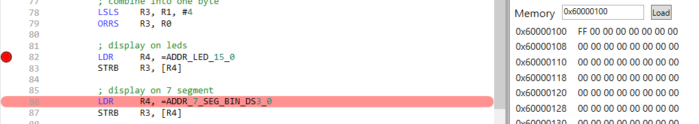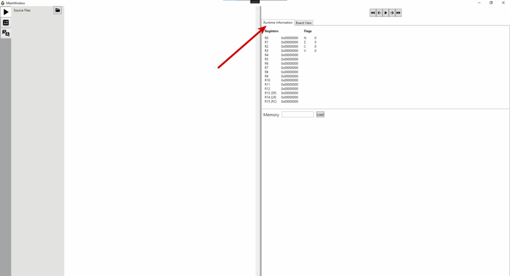 Die Memory-Ansicht des Simulators zeigt den Inhalt des Speichers in Hexadezimalformat. Diese Ansicht ist nützlich, um den Zustand des Speichers zu überprüfen und spezifische Daten zu lokalisieren. Mit der integrierten Suchfunktion kann direkt zu einer bestimmten Adresse gesprungen werden, indem die Adresse ins Eingabefeld neben dem Load-Button eingegeben und mit dem Anklicken des Load-Button bestätigt wird.