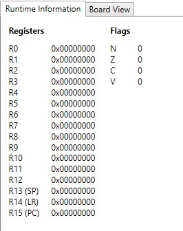 Im oberen Bereich der Runtime-Information werden die Werte in den Registern R0 bis R15 dargestellt. Diese Register speichern Zwischenwerte, die bei der Ausführung von Befehlen im Simulator verwendet werden.